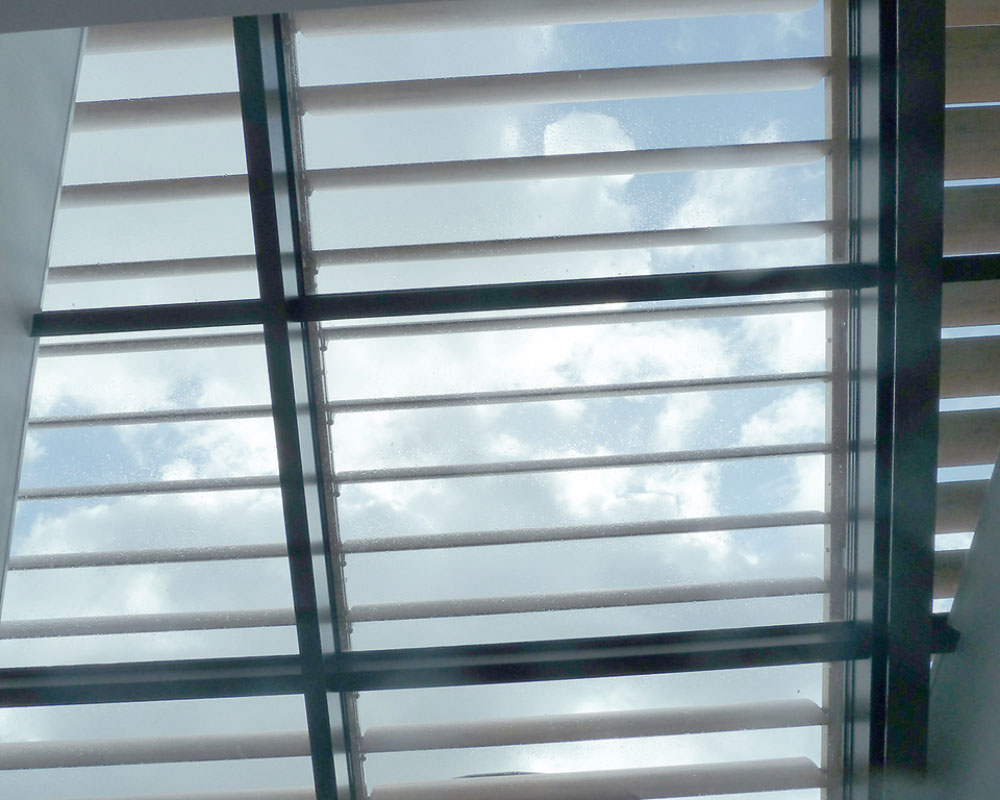 Brise-soleil orientable sur verrière imitation bois en aluminium AZUR.